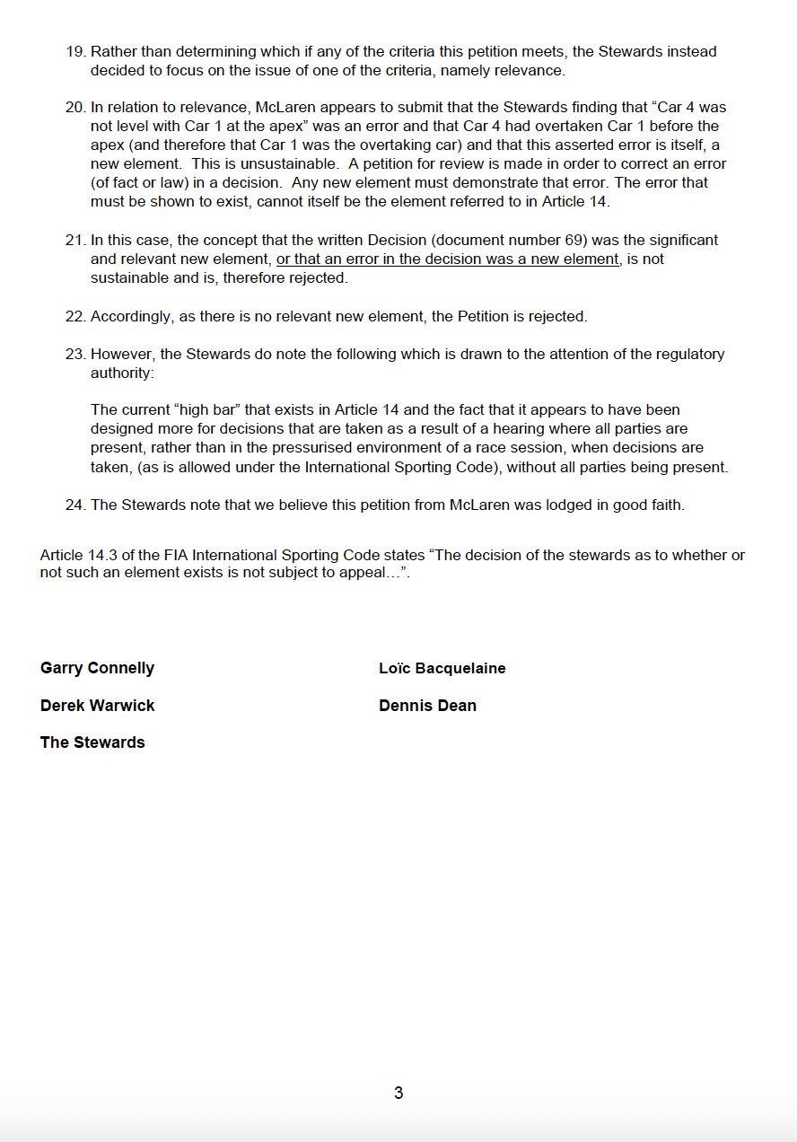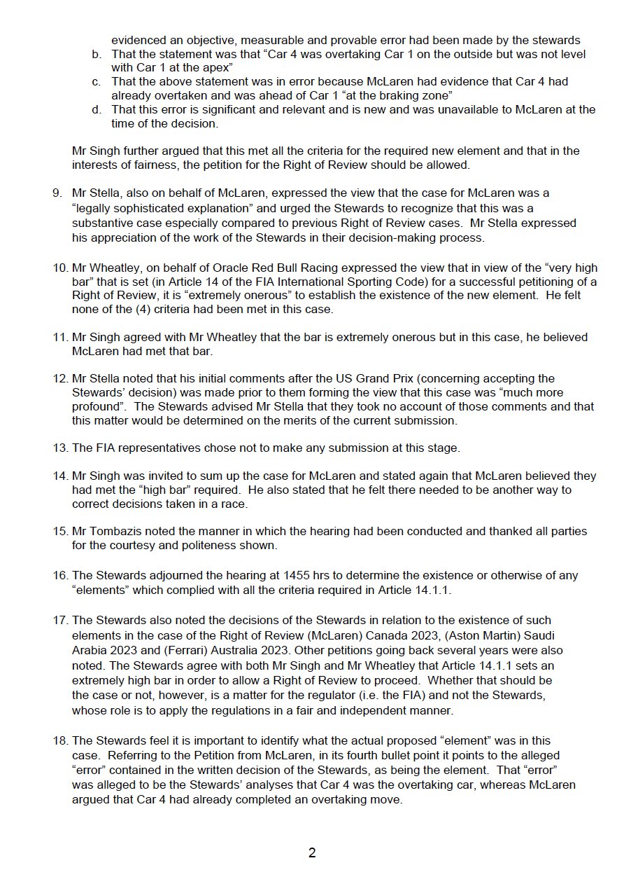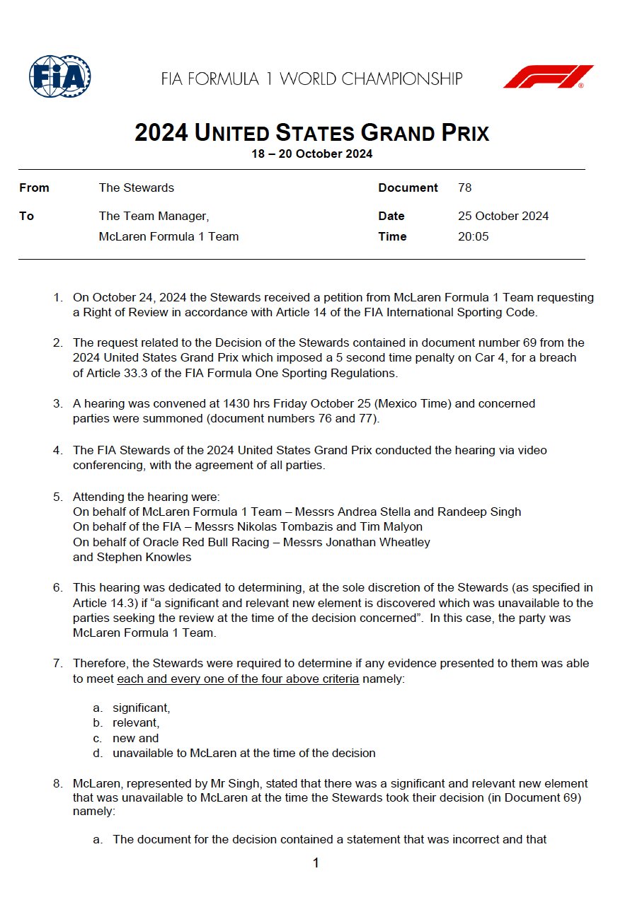 “The decision of the stewards as to whether or not such an element exists is not subject to appeal (La decisione dei commissari sportivi sull’esistenza o meno di tale elemento non è soggetta ad appello)”. Questa è la chiosa di un documento di tre pagine pubblicato dalla FIA dopo il ricorso della McLaren sulle decisioni finali prese nei confronti di Lando Norris nel Gran Premio degli Stati Uniti. Insomma, l’appello del team di Woking è stato nuovamente bocciato, poiché il collegio giudicante ha stabilito che le prove presentate dal team non erano sufficienti.