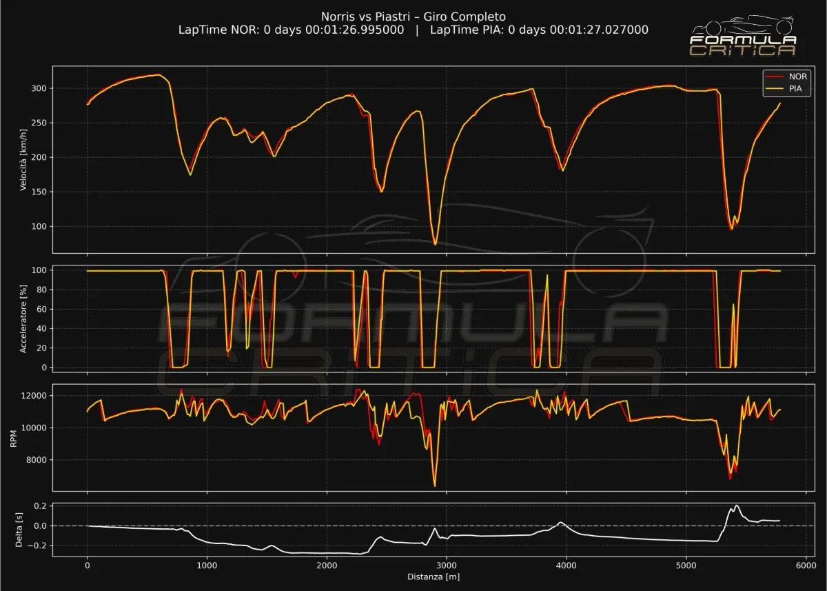 Osservando il grafico in basso è possibile verificare, nella quarta riga, la differenza cronometrica tra i due. Charles parte bene ma accumula gap via via che il giro scorre. Nella prima riga abbiamo le velocità, nella seconda l’apertura dell’acceleratore, nella terza i giri motore.