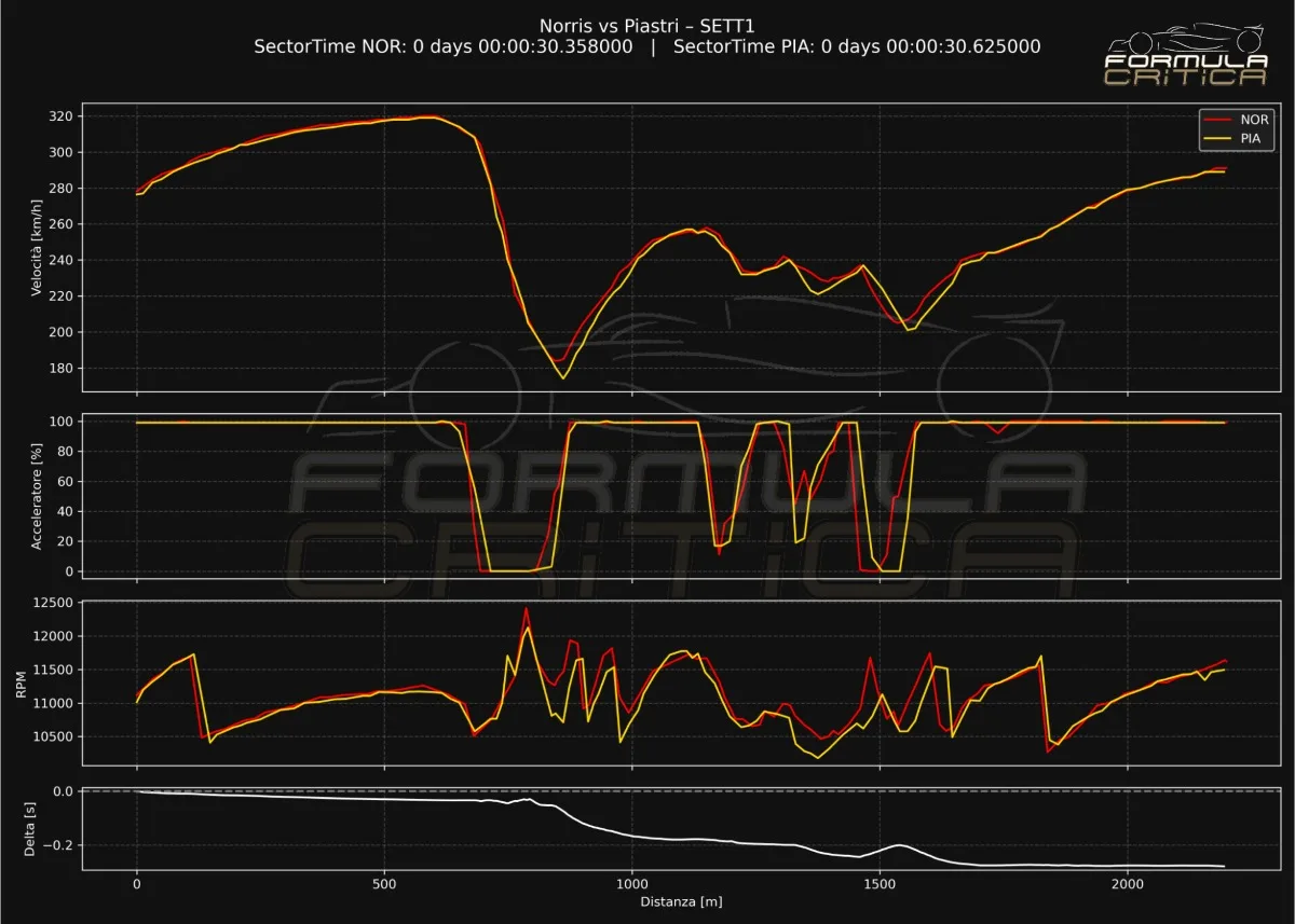 Ma ora concentriamoci sul raffronto tra il giro del poleman Max Verstappen effettuato col tempo di 1.26.983 e quello della prima Ferrari, quella di Charles Leclerc, chiuso con il crono di 1.27.299. 316 millesimi di differenza tra la RB21 e la SF-25. Ecco dove sono stati accumulati.