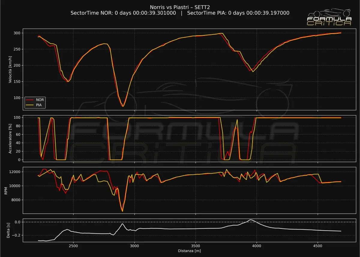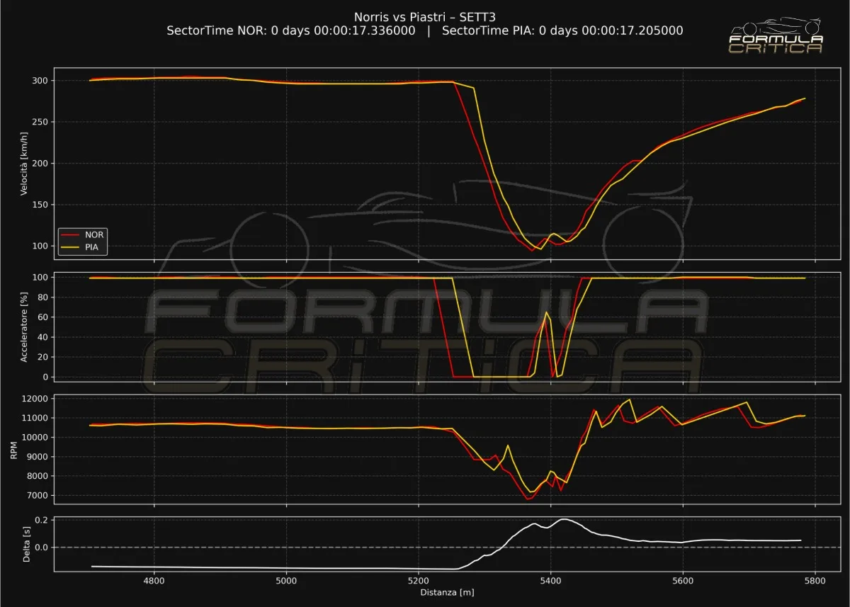 Il quattro volte iridato riesce a entrare più veloce per poi essere più conservativo tra le due curve che compongono la Spoon. Ma in uscita ha molta più velocità che “spara” nel rettilineo di ritorno. Anche qui, in ogni caso, non c’è molta differenza nel delta time. Nel complesso la RB21 non guadagna in questa doppia curva sinistrorsa. Due interpretazioni di guida che portano a differenze esigue.