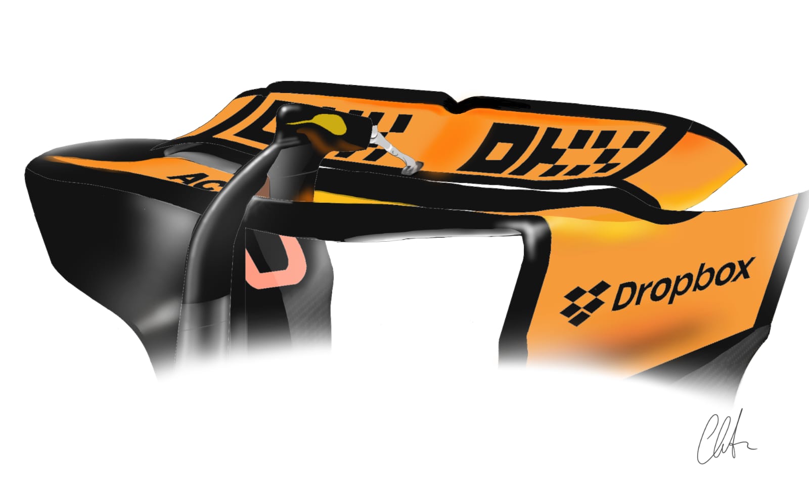 Ricordiamo che questo elemento è stato oggetto di grandi dibattiti e polemiche, poiché durante il Gran Premio dell’Azerbaigian era emersa la questione relativa al mini DRS (disegno in alto), risolta dagli stessi tecnici di Woking dopo l’osservazione e i susseguenti suggerimenti della Federazione Internazionale dell’Automobile, che comunque aveva considerato il pezzo regolare, dato che superava tutti i test statici previsti dalle norme.