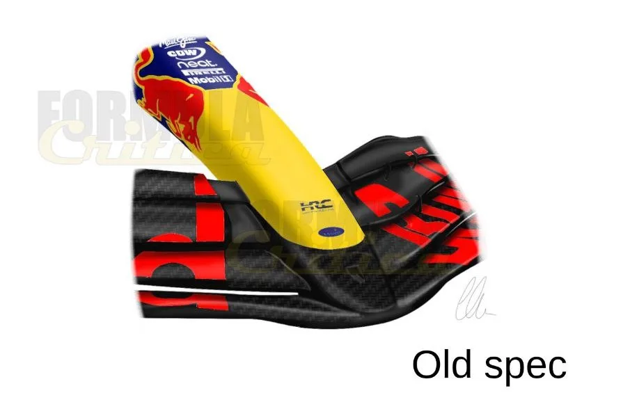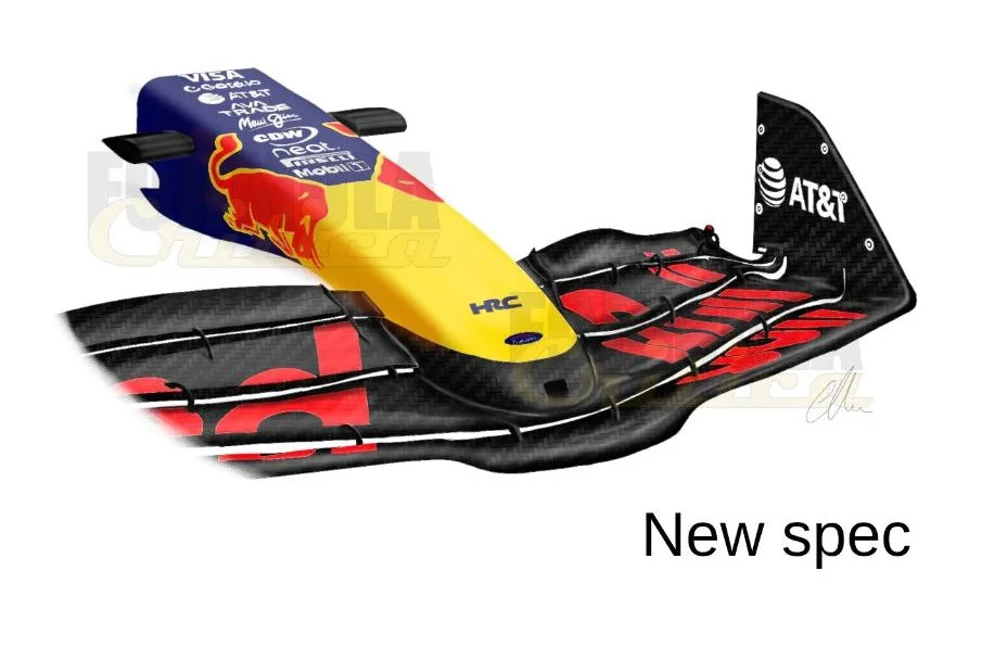 Per l’ultima giornata di test, Red Bull ha portato un nuovo alettone anteriore e un fondo modificato. L’ala anteriore (in alto la comparazione tra le due versioni) ha funzionato, il fondo no. Il pavimento ha reso la vettura instabile, tanto che è stato sostituito con la versione precedente nel corso dell’ultima giornata.