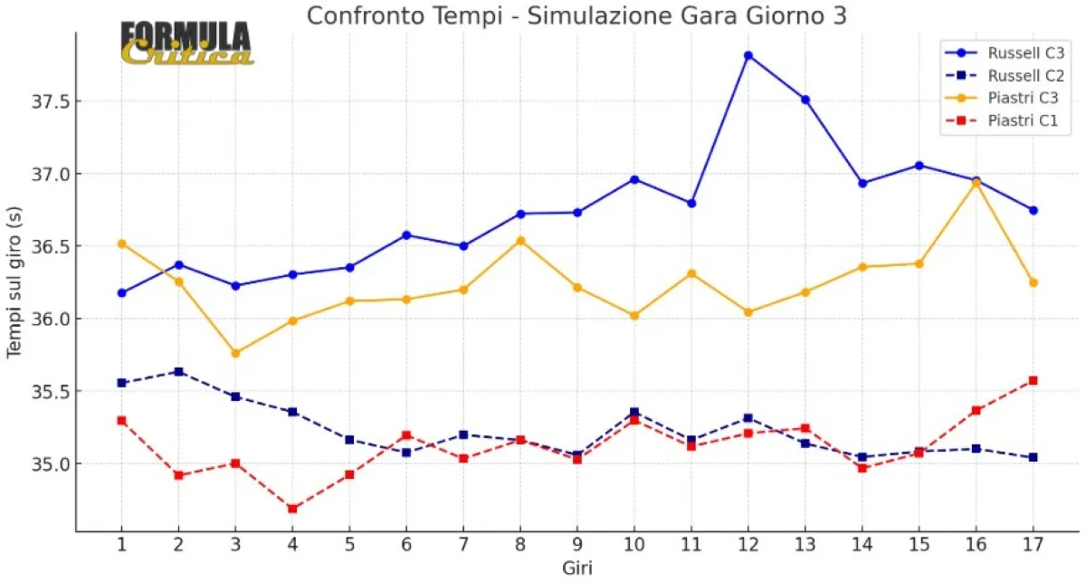 Oscar Piastri, oggi, e Lando Norris, ieri (qui l’analisi numerica), hanno impressionato per costanza e velocità nel corso della simulazione gara. La MCL39 ha mostrato un passo solido e costante, senza degrado apprezzabile su un apista che, per caratteristiche, chiede molto alle gomme Pirelli che per la gara porterà le mescole più dure del ventaglio 2025. Stint lunghi e senza particolari cali di prestazione per la vettura di Woking.