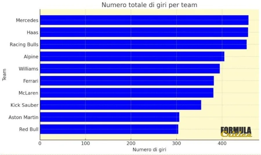 Con 458 giri totali, la Mercedes è stata la squadra che ha percorso più chilometri nei test. Un dato che riporta alla mente le stagioni vincenti del team anglo-tedesco, quando la loro affidabilità e capacità di accumulare dati rappresentavano un punto di forza determinante. Si ricordino, in tal senso, le sessioni dei primi anni dell’era turbo-ibrida: mentre le Frecce d’Argento accumulavano chilometri in forza di una power unit più avanzata e solida, le concorrenti passavano lunghi periodi ai box per gestire le defaillance propulsive tipiche di una nuova generazione di motori.