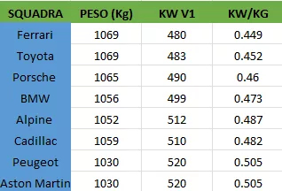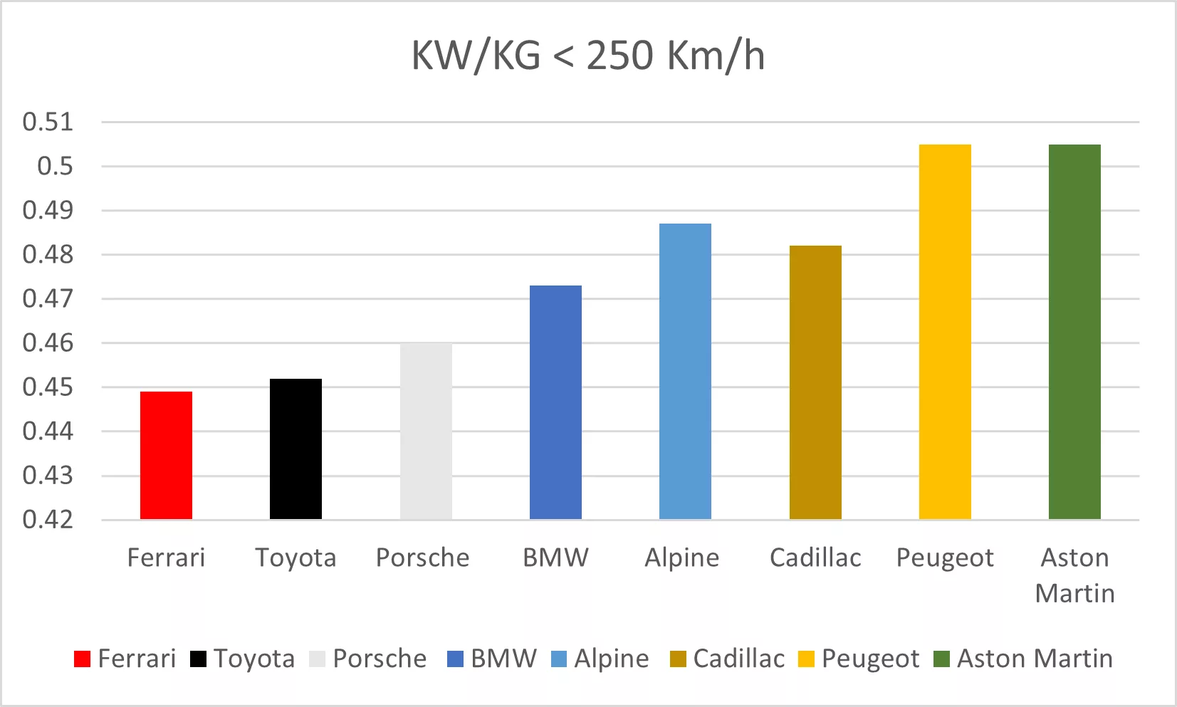 Come riportato, i rapporti peso-potenza sotto ai 250 Km/h (V1) sono rimasti pressoché invariati. Ferrari resta la vettura col rapporto peggiore, seguita da Toyota, sempre tra le peggiori. Migliora Alpine, grazie ai 6 KW concessi, mentre Cadillac resta la terza col terzo migliore rapporto.