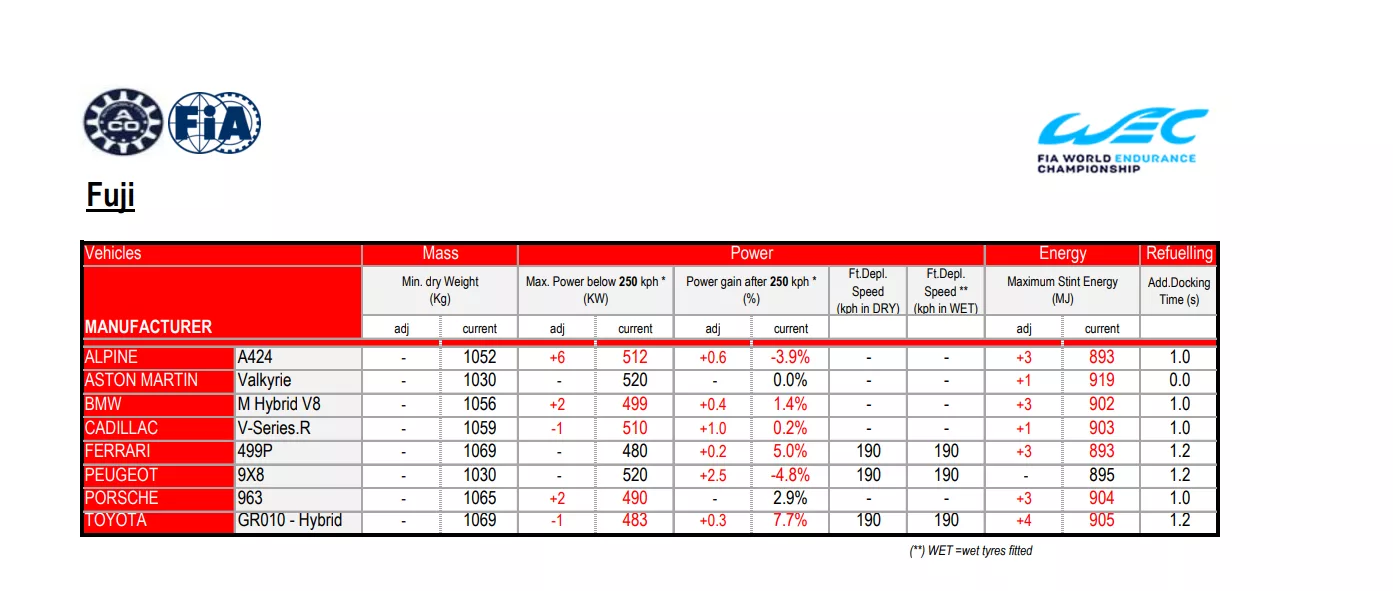 Proprio il bagnato ha dato una chance a Porsche, e l’equipaggio #6 non ha esitato nel prendersela, andando così a vincere. Perciò, a livello tecnico, è attesa la conferma definitiva dei progressi compiuti nell’inverno dalle 499P, rimaste quindi le vetture più pesanti, assieme alle GR010 a quota 1069 Kg. Il rapporto peso-potenza sotto ai 250 Km/h resta anch’esso invariato per molti, con le uniche eccezioni valide per Alpine, BMW, Cadillac, Porsche e Toyota.
