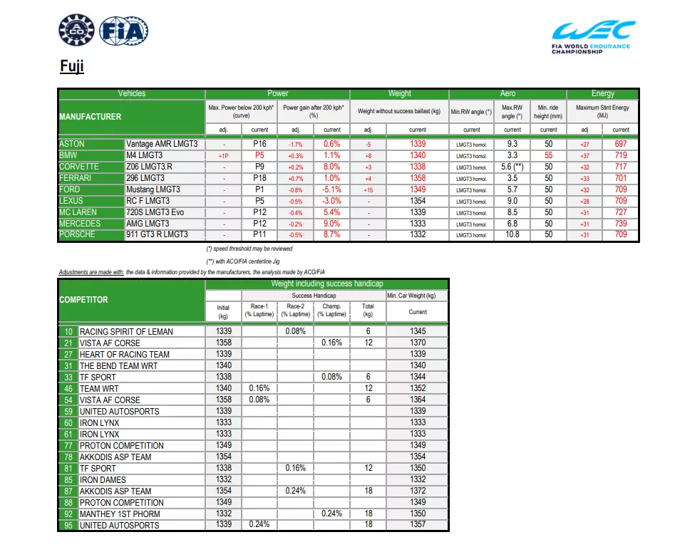Nelle LMGT3, dopo la vittoria della McLaren di United Autosport e la grande prestazione delle Mustang al COTA, FIA e ACO hanno apportato dei cambiamenti. Le Ford di Proton Competition ingrassano di ben 15 Kg, salendo a quota 1349 Kg. Sale anche Ferrari, che senza Success Handicap prende 4 Kg raggiungendo i 1358. Assieme a loro anche BMW (+8 Kg) e Corvette (+3 Kg). Scende, invece, Aston, arrivando a quota 1339 Kg.